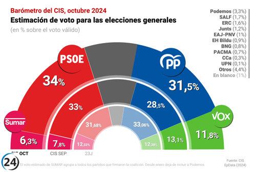 El PSOE consolida su liderazgo en las encuestas del CIS, mientras el PP reduce la distancia a solo 2,5 puntos.