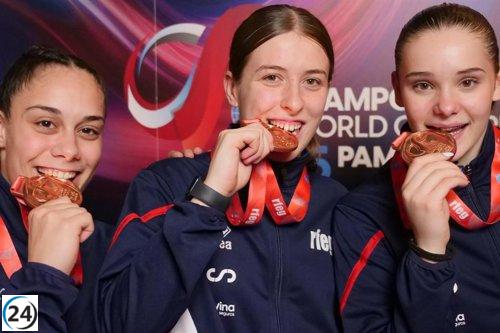 España logra el tercer lugar en la competición por equipos de DMT femenino en el Mundial de gimnasia trampolín.