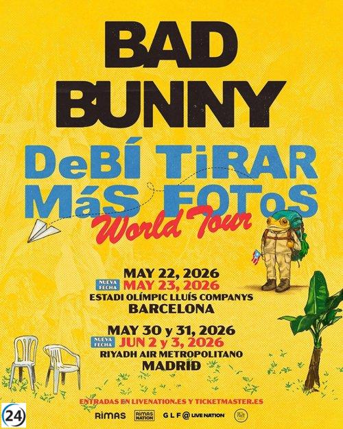 Bad Bunny amplía su gira 2026 con más conciertos en Barcelona y Madrid.
