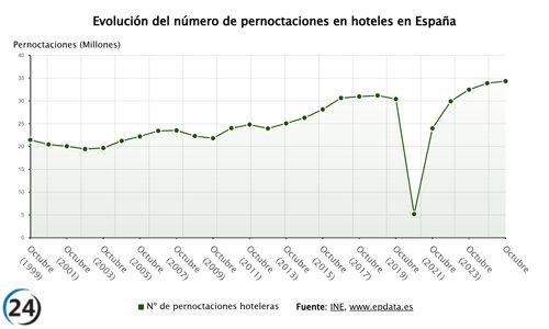 El turismo hotelero en España crece un 1,3% en octubre, alcanzando 34,2 millones de noches alojadas.