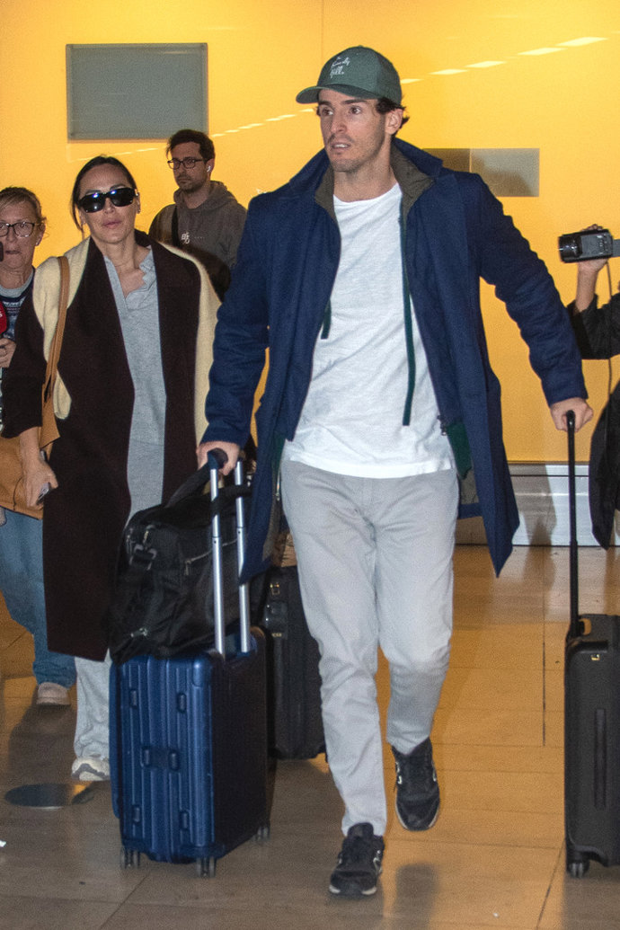 Para el viaje, Tamara ha optado por un chándal gris que combina a la perfección con un abrigo oversize en un tono marrón chocolate. Esta fusión de estilos, unida a un suave jersey de lana color crema que lleva sobre los hombros, demuestra su habilidad para destacar en un ambiente de moda contemporánea.