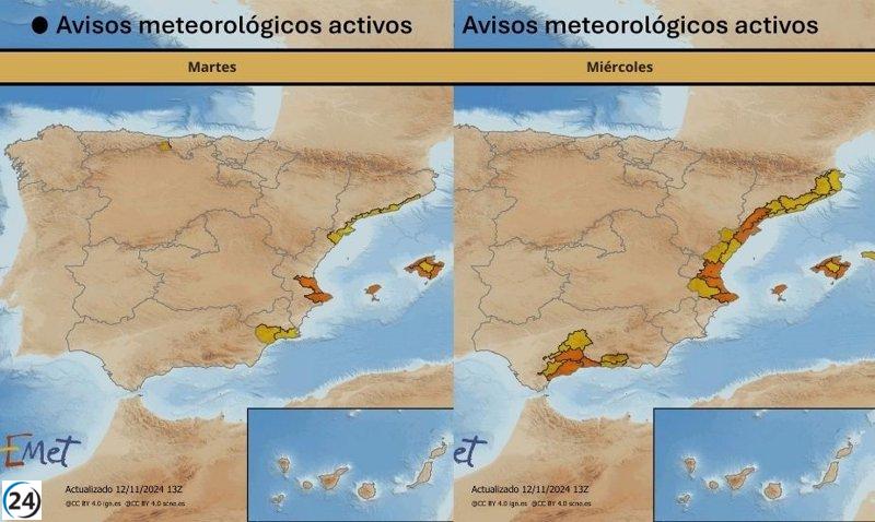 Para la tarde y noche de este martes, así como durante el día miércoles, se anticipan lluvias persistentes y de gran intensidad en diversas zonas mencionadas. Esto incluye un aviso en la Comunidad Valenciana, donde se ha activado la alerta naranja por precipitaciones en el litoral, además de un aviso amarillo por vientos del norte y nordeste que podrían alcanzar velocidades de entre 50 y 60 km/h, generando olas de hasta cuatro metros de altura.